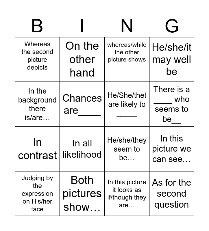 This bingo card has 16 words: Both pictures show…, In this picture we can see…, whereas/while the other picture shows, Whereas the second picture depicts, In contrast, On the other hand, He/she/they seem to be…, In this picture it looks as if/though they are…, In the background there is/are…, Chances are____, Judging by the expression on His/her face, He/she/it may well be, In all likelihood, There is a ____ who seems to be__, He/She/thet are likely to _____ and As for the second question.