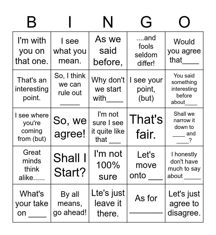 This bingo card has a free space and 24 words: Shall I Start?, By all means, go ahead!, Why don't we start with____, What's your take on ____, Would you agree that____, I'm with you on that one., That's an interesting point., I see what you mean., That's fair., I'm not 100% sure, I see your point, (but), I see where you're coming from (but), Let's move onto ___, I honestly don't have much to say about _____, So, I think we can rule out _____, As for _______, Shall we narrow it down to ____ and ____?, As we said before,, You said something interesting before about____, So, we agree!, Let's just agree to disagree., Great minds think alike......, ....and fools seldom differ! and Lte's just leave it there..
