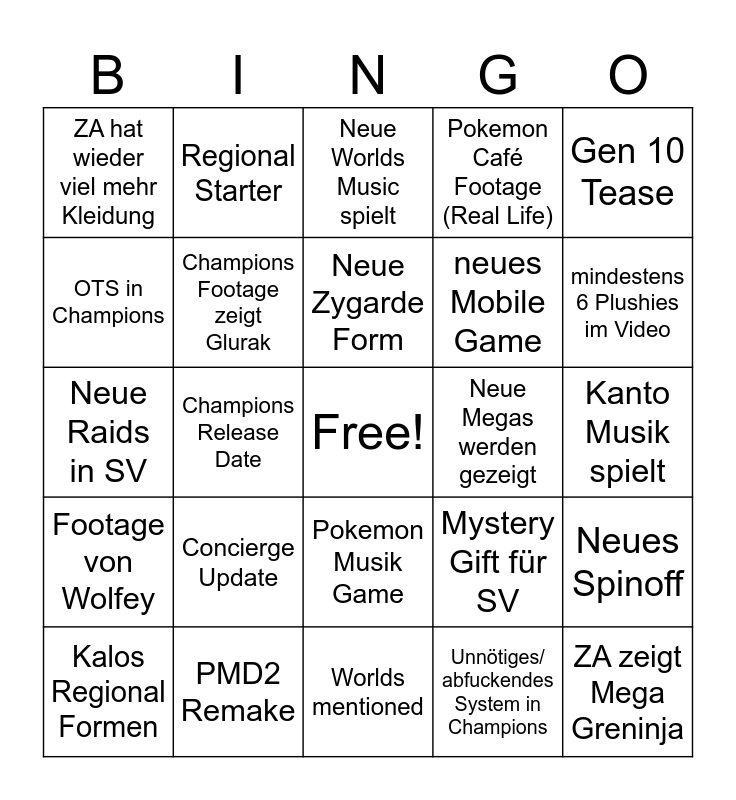 This bingo card has a free space and 24 words: Concierge Update, PMD2 Remake, Neue Zygarde Form, Kalos Regional Formen, Gen 10 Tease, ZA hat wieder viel mehr Kleidung, OTS in Champions, Regional Starter, Neue Megas werden gezeigt, Pokemon Musik Game, neues Mobile Game, Neue Raids in SV, Mystery Gift für SV, Neues Spinoff, Champions Footage zeigt Glurak, Unnötiges/ abfuckendes System in Champions, Kanto Musik spielt, Neue Worlds Music spielt, mindestens 6 Plushies im Video, Champions Release Date, ZA zeigt Mega Greninja, Footage von Wolfey, Pokemon Café Footage (Real Life) and Worlds mentioned.
