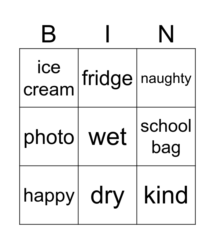 This bingo card has 9 words: happy, naughty, fridge, photo, ice cream, school bag, wet, kind and dry.