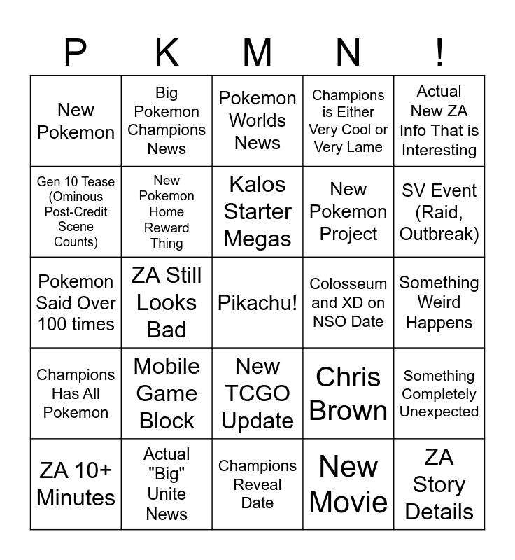 This bingo card has a free space and 24 words: Mobile Game Block, Actual "Big" Unite News, Kalos Starter Megas, ZA 10+ Minutes, Actual New ZA Info That is Interesting, New Pokemon, Gen 10 Tease (Ominous Post-Credit Scene Counts), Big Pokemon Champions News, Colosseum and XD on NSO Date, New TCGO Update, New Pokemon Project, Pokemon Said Over 100 times, Chris Brown, Something Completely Unexpected, New Pokemon Home Reward Thing, New Movie, Something Weird Happens, Pokemon Worlds News, SV Event (Raid, Outbreak), ZA Still Looks Bad, ZA Story Details, Champions Has All Pokemon, Champions is Either Very Cool or Very Lame and Champions Reveal Date.