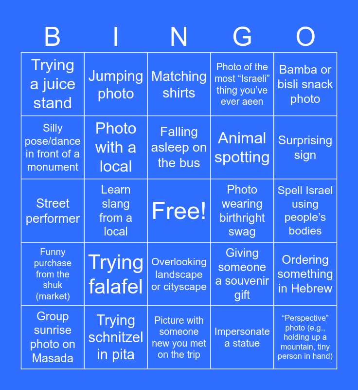 This bingo card has a free space and 24 words: Trying falafel, Trying schnitzel in pita, Falling asleep on the bus, Group sunrise photo on Masada, Bamba or bisli snack photo, Trying a juice stand, Silly pose/dance in front of a monument, Jumping photo, Photo wearing birthright swag, Overlooking landscape or cityscape, Animal spotting, Street performer, Giving someone a souvenir gift, Ordering something in Hebrew, Photo with a local, Impersonate a statue, Spell Israel using people’s bodies, Matching shirts, Surprising sign, Learn slang from a local, “Perspective” photo (e.g., holding up a mountain, tiny person in hand), Funny purchase from the shuk (market), Photo of the most “Israeli” thing you’ve ever aeen and Picture with someone new you met on the trip.