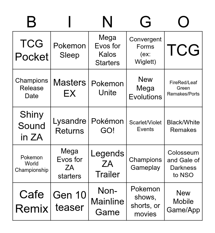 This bingo card has a free space and 24 words: Mega Evos for ZA starters, Gen 10 teaser, Pokemon Unite, Cafe Remix, TCG, TCG Pocket, Champions Release Date, Pokemon Sleep, Scarlet/Violet Events, Legends ZA Trailer, New Mega Evolutions, Shiny Sound in ZA, Champions Gameplay, Colosseum and Gale of Darkness to NSO, Masters EX, Pokemon shows, shorts, or movies, Black/White Remakes, Mega Evos for Kalos Starters, FireRed/Leaf Green Remakes/Ports, Lysandre Returns, New Mobile Game/App, Pokemon World Championship, Convergent Forms (ex: Wiglett) and Non-Mainline Game.