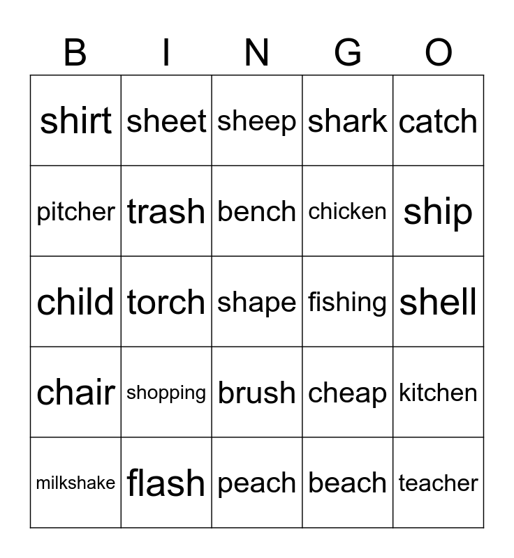 This bingo card has a free space and 24 words: shopping, flash, bench, milkshake, catch, shirt, pitcher, sheet, fishing, brush, chicken, child, cheap, kitchen, trash, beach, shell, sheep, ship, torch, teacher, chair, shark and peach.