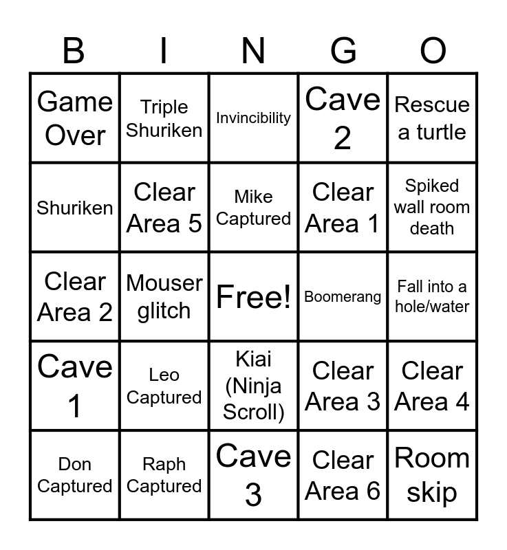 This bingo card has a free space and 24 words: Leo Captured, Raph Captured, Mike Captured, Don Captured, Rescue a turtle, Game Over, Shuriken, Triple Shuriken, Boomerang, Kiai (Ninja Scroll), Clear Area 1, Clear Area 2, Clear Area 3, Clear Area 4, Clear Area 5, Clear Area 6, Fall into a hole/water, Invincibility, Spiked wall room death, Mouser glitch, Room skip, Cave 1, Cave 2 and Cave 3.