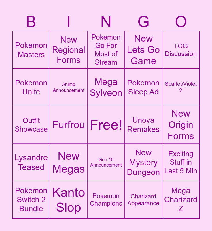 This bingo card has a free space and 24 words: New Megas, Kanto Slop, Mega Sylveon, Pokemon Switch 2 Bundle, TCG Discussion, Pokemon Masters, Pokemon Unite, New Regional Forms, Unova Remakes, Gen 10 Announcement, Pokemon Sleep Ad, Outfit Showcase, New Mystery Dungeon, Exciting Stuff in Last 5 Min, Anime Announcement, Charizard Appearance, New Origin Forms, Pokemon Go For Most of Stream, Scarlet/Violet 2, Furfrou, Mega Charizard Z, Lysandre Teased, New Lets Go Game and Pokemon Champions.