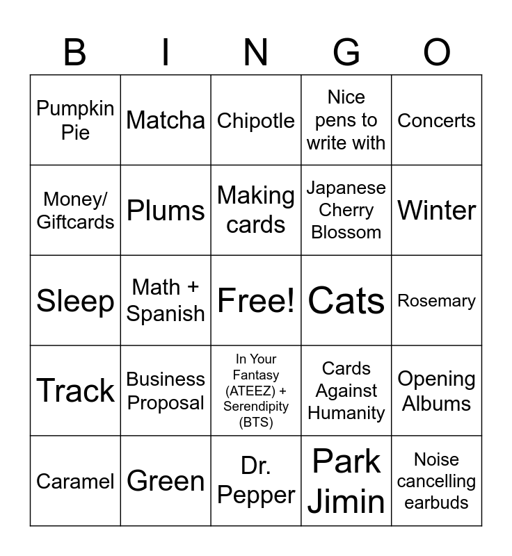This bingo card has a free space and 34 words: BTS, Park Jimin, Mingi Bot, Soccer, Track, Plums, Concerts, Caramel, Matcha, Iced Coffee, Making cards, Chipotle, Sweden, Hawaii, Cats, Winter, Green, Sleep, Business Proposal, Cards Against Humanity, In Your Fantasy (ATEEZ) + Serendipity (BTS), Stranger Things, Pumpkin Pie, Rosemary, Dr. Pepper, Noise cancelling earbuds, Nice pens to write with, Taking pretty notes, Japanese Cherry Blossom, Money/ Giftcards, Hanging out w/ family, Math + Spanish, Opening Albums and Hanging out with my cousin.