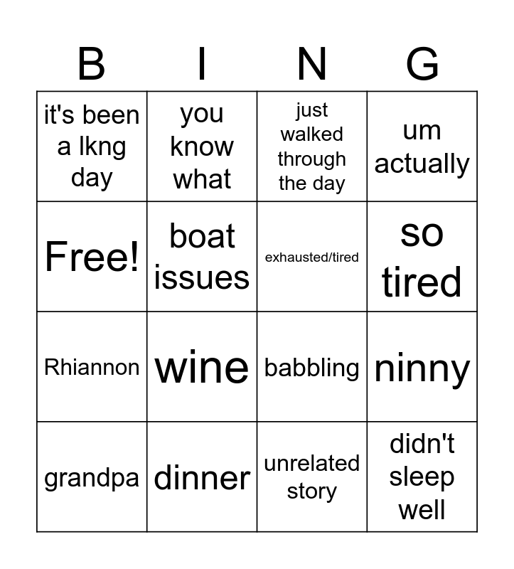 This bingo card has 16 words: dinner, ninny, just walked through the day, it's been a lkng day, Rhiannon, you know what, babbling, unrelated story, Free!, boat issues, grandpa, um actually, wine, so tired, exhausted/tired and didn't sleep well.