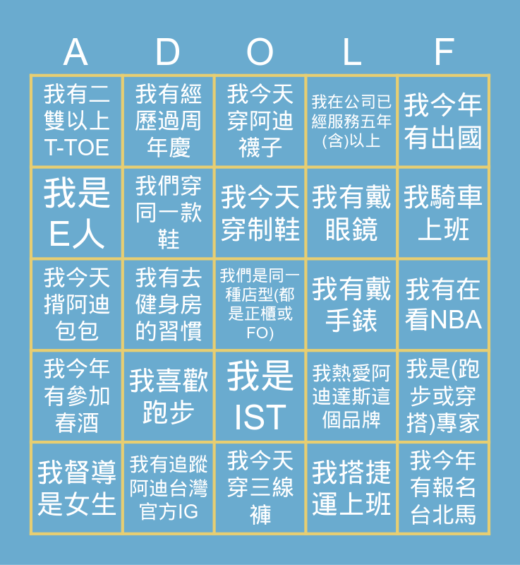 This bingo card has 25 words: 我喜歡跑步, 我今天穿三線褲, 我今天穿制鞋, 我督導是女生, 我今年有出國, 我有二雙以上T-TOE, 我是E人, 我有經歷過周年慶, 我有戴手錶, 我是IST, 我有戴眼鏡, 我今天揹阿迪包包, 我熱愛阿迪達斯這個品牌, 我是(跑步或穿搭)專家, 我們穿同一款鞋, 我今年有報名台北馬, 我有在看NBA, 我今天穿阿迪襪子, 我騎車上班, 我有去健身房的習慣, 我們是同一種店型(都是正櫃或FO), 我有追蹤阿迪台灣官方IG, 我今年有參加春酒, 我在公司已經服務五年(含)以上 and 我搭捷運上班.