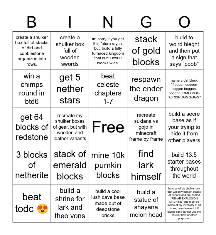 This bingo card has a free space and 24 words: stack of emerald blocks, build a shrine for lark and theo vons, beat celeste chapters 1-7, beat todc 😍, build to wolrd hieght and then put a sign that says "poob", create a shulker box full of stacks of dirt and cobblestone organized into rows., win a chimps round in btd6, create a shulker box full of wooden swords, recreate suklana vs gojo in minecraft frame by frame, mine 10k pumkin blocks, respawn the ender dragon, get 64 blocks of redstone, find lark himself, build 13.5 starter bases throughout the world, get 5 nether stars, build a statue of shayana melon head, build a secre base as if your trying to hide it from other players, im sorry if you get this future rayce, but, build a fully furnaced kingdom that is 500x500 blocks wide., name a dirt block "froggon doggon loggon boggon poggon, OMG POG RZRISPUGGGGGG", recreate my shulker boxes of gear, but with wooden and leather variants, have a yellow shulker box that will only contain stacks of penaris and are named "PENAR EXPLOSION MACHINE" and must be inside of my inventory at all times, i can take out tuff blocks can i cannot use the shulker box for other purposes., 3 blocks of netherite, stack of gold blocks and build a cool lush cave base made out of deepstone bricks.