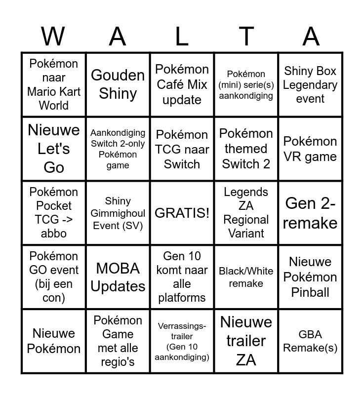 This bingo card has a free space and 24 words: MOBA Updates, Pokémon Game met alle regio's, Pokémon TCG naar Switch, Nieuwe Pokémon, Shiny Box Legendary event, Pokémon naar Mario Kart World, Nieuwe Let's Go, Gouden Shiny, Legends ZA Regional Variant, Gen 10 komt naar alle platforms, Pokémon themed Switch 2, Pokémon Pocket TCG -> abbo, Black/White remake, Nieuwe Pokémon Pinball, Aankondiging Switch 2-only Pokémon game, Nieuwe trailer ZA, Gen 2-remake, Pokémon Café Mix update, Pokémon VR game, Shiny Gimmighoul Event (SV), GBA Remake(s), Pokémon GO event (bij een con), Pokémon (mini) serie(s) aankondiging and Verrassings- trailer (Gen 10 aankondiging).