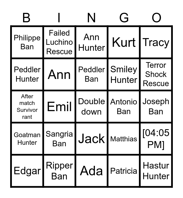 This bingo card has 247 words: Free!, 5 cipher survivor down, 4 Kill, All Escape, 3 escape, Tie, 1 Escape, Dungeon escape, 5 cipher kite, Basement Party, 1 Escape, 51% rescue, Sell, Failed Rescue, Last Second Rescue, Late Rescue, Downed Rescue, Double down, Terror Shock, Terror Shock Rescue, Tracy 2.0, Leo Ban, Smiley Ban, Gamekeeper Ban, Ripper Ban, Soul Weaver Ban, Wu Chang Ban, Photographer Ban, Geisha Ban, Ann Ban, Alva Ban, Naiad Ban, Nightmare Ban, Mad Eyes Ban, Galatea Ban, Luchino Hunter Ban, Yidhra Ban, Hastur Ban, Mary Ban, Bonbon Ban, Antonio Ban, Robie Ban, Clerk Ban, Percy Ban, Ithaqua Ban, Opera Singer, BW Ban, FG Ban, Ivy Ban, Hulla Ban, Goatman Ban, Peddler Ban, Leo Hunter, Smiley Hunter, Gamekeeper Hunter, Ripper Hunter, Soul Weaver Hunter, Wu Chang Hunter, Photographer Hunter, Geisha Hunter, Ann Hunter, Alva Hunter, Naiad Hunter, Nightmare Hunter, Mad Eyes Hunter, Galatea Hunter, Luchino Hunter, Yidhra Hunter, Hastur Hunter, Mary Hunter, Bonbon Hunter, Antonio Hunter, Robbie Hunter, Clerk Hunter, Percy Hunter, Ithaqua Hunter, Opera Singer Hunter, BW Hunter, FG Hunter, Ivy Hunter, Hulla Hunter, Goatman Hunter, Peddler Hunter, No Build, No borrowed time, Tide Knee Jerk Composer, Rescuer Mind's eye, Your on your own, Faro Lady Basement Rescue, Meta Hunter, No Decoder Team, All Decoder Team, All Kiter, All Rescuer, All Support, All sui, Lucky Guy, Aeroplanist, Explorer Ban, No Harasser Team, Forward Ban, Ball user player, Greedy Hunter, Bias Hunter, Excitement, Patroller, Listen, Naib no tide, Moonpark Wuwu, Friendly Hunter, Adamil, Freaky Norton, Forgot queue, Abandoned Match, Lose before Surrender time, Failed Luchino Rescue, Double Teaming match start, Tunneling whole game, Robot Hunter, Lag Hunter, After match Hunter rant, After match Survivor rant, Survivor with sus name, Hunter smacking the chair, Survivor dancing in front of chair, Prematch I hate "" users, Couple/Matching names, Top and Bot frag Duo, Matching Photo/Frames, Greedy Survivor, Gun gate camp, Double Rescue, Leo Ban, Joker H Ban, Bane Ban, Jack Ban, Violetta Ban, Geisha Ban, Wuwu Ban, Joseph Ban, Burke Ban, Hastur Ban, Yidhra Ban, Robbie Ban, Luchino H Ban, Mary Ban, Bonbon Ban, Ann Ban, Galatea Ban, Percy Ban, Antonio Ban, BW Ban, Grace Ban, Philippe Ban, Orphy H Ban, Keigan Ban, Alva Ban, Ithaqua Ban, Sangria Ban, Norton H Ban, Ivy Ban, Jeffrey Ban, Hulla Ban, Valentina Ban (edited), [04:05 PM], Leo, Joker H, Bane, Jack, Violetta, Geisha, Wuwu, Joseph, Burke, Hastur, Yidhra, Robbie, Luchino H, Mary, Bonbon, Ann, Galatea, Percy, Antonio, BW, Grace, Philippe, Orphy H, Keigan, Alva, Ithaqua, Sangria, Norton H, Ivy, Jeffrey, Hulla, Valentina (edited), [04:08 PM], Emily, Freddy, Kreacher, Emma, Servais, Kurt, Naib, Martha, Fiona, Tracy, William, Helena, Vera, Kevin, Margaretha, Eli, Aesop, Norton, Patricia, Murrow, Mike, Jose, Demi, Victor, Andrew, Luca, Melly, Edgar, Ganji, Annie, Emil, Ada, Orpheus, Memory, Joker, Luchino, Qi Shiyi, Fredrick, Alice, Charles, Lily, Matthias, Florian, Evelyn, Richard, Wendy, Brynhlidr, Efron and Deduction Substitute.
