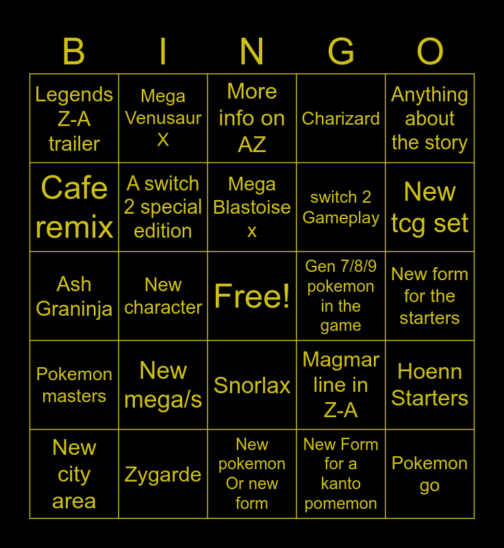 This bingo card has a free space and 24 words: New mega/s, Zygarde, Mega Blastoise x, New city area, Anything about the story, Legends Z-A trailer, Cafe remix, Mega Venusaur X, Gen 7/8/9 pokemon in the game, Snorlax, switch 2 Gameplay, Ash Graninja, Magmar line in Z-A, Hoenn Starters, A switch 2 special edition, New Form for a kanto pomemon, New form for the starters, More info on AZ, New tcg set, New character, Pokemon go, Pokemon masters, Charizard and New pokemon Or new form.