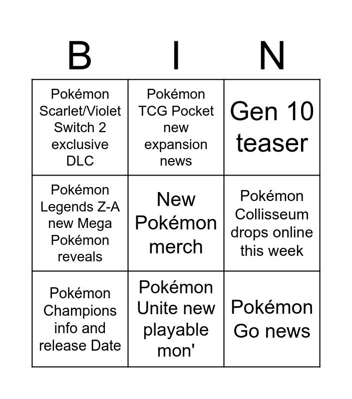 This bingo card has a free space and 8 words: Pokémon Collisseum drops online this week, Gen 10 teaser, Pokémon TCG Pocket new expansion news, Pokémon Champions info and release Date, Pokémon Scarlet/Violet Switch 2 exclusive DLC, Pokémon Go news, Pokémon Legends Z-A new Mega Pokémon reveals and Pokémon Unite new playable mon'.