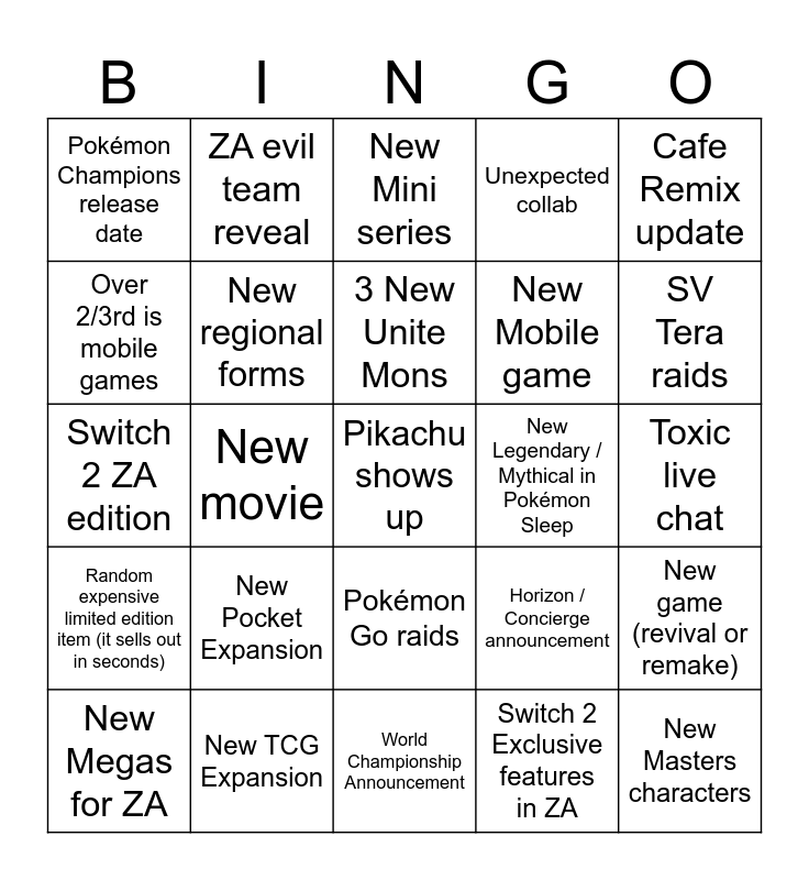 This bingo card has a free space and 24 words: New Pocket Expansion, New TCG Expansion, 3 New Unite Mons, New Megas for ZA, Cafe Remix update, Pokémon Champions release date, Over 2/3rd is mobile games, ZA evil team reveal, New Legendary / Mythical in Pokémon Sleep, Pokémon Go raids, New Mobile game, Switch 2 ZA edition, Horizon / Concierge announcement, New game (revival or remake), New regional forms, Switch 2 Exclusive features in ZA, Toxic live chat, New Mini series, SV Tera raids, New movie, New Masters characters, Random expensive limited edition item (it sells out in seconds), Unexpected collab and World Championship Announcement.