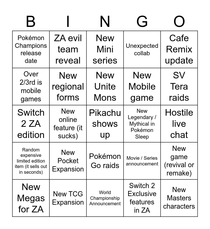 This bingo card has a free space and 24 words: New Pocket Expansion, New TCG Expansion, New Unite Mons, New Megas for ZA, Cafe Remix update, Pokémon Champions release date, Over 2/3rd is mobile games, ZA evil team reveal, New Legendary / Mythical in Pokémon Sleep, Pokémon Go raids, New Mobile game, Switch 2 ZA edition, Movie / Series announcement, New game (revival or remake), New regional forms, Switch 2 Exclusive features in ZA, Hostile live chat, New Mini series, SV Tera raids, New online feature (it sucks), New Masters characters, Random expensive limited edition item (it sells out in seconds), Unexpected collab and World Championship Announcement.