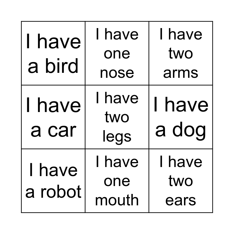 This bingo card has a free space and 13 words: I have two eyes, I have a cat, I have a robot, I have one nose, I have a car, I have two ears, I have a yo-yo, I have a fish, I have one mouth, I have a bird, I have a dog, I have two arms and I have a ball.