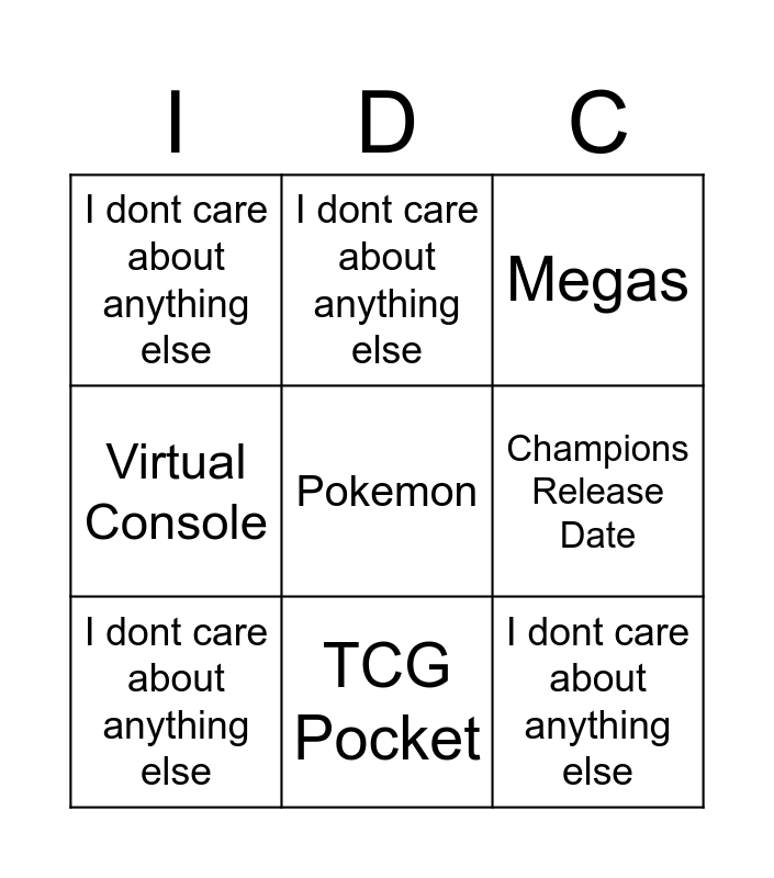 This bingo card has a free space and 8 words: Champions Release Date, Megas, I dont care about anything else, I dont care about anything else, I dont care about anything else, I dont care about anything else, Virtual Console and TCG Pocket.