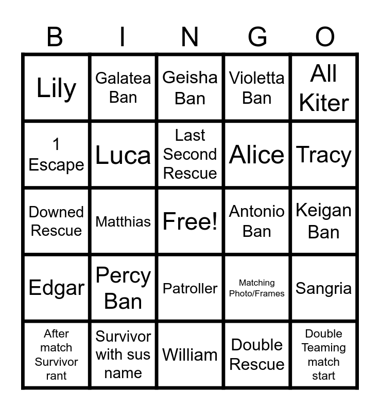 This bingo card has a free space and 182 words: 4 Kill, All Escape, 3 escape, Tie, 1 Escape, Dungeon escape, 5 cipher kite, Basement Party, 1 Escape, 51% rescue, Sell, Failed Rescue, Last Second Rescue, Late Rescue, Downed Rescue, Double down, Terror Shock, Terror Shock Rescue, Tracy 2.0, No Build, No borrowed time, Tide Knee Jerk Composer, Rescuer Mind's eye, Your on your own, Faro Lady Basement Rescue, Meta Hunter, No Decoder Team, All Decoder Team, All Kiter, All Rescuer, All Support, All sui, No Harasser Team, Ball user player, Greedy Hunter, Bias Hunter, Naib no tide, Moonpark Wuwu, Friendly Hunter, Adamil, Freaky Norton, Forgot queue, Abandoned Match, Lose before Surrender time, Failed Luchino Rescue, Double Teaming match start, Tunneling whole game, Robot Hunter, Lag Hunter, After match Hunter rant, After match Survivor rant, Survivor with sus name, Hunter smacking the chair, Survivor dancing in front of chair, Prematch I hate "" users, Couple/Matching names, Top and Bot frag Duo, Matching Photo/Frames, Greedy Survivor, Gun gate camp, Double Rescue, Leo, Joker H, Bane, Jack, Violetta, Geisha, Wuwu, Joseph, Burke, Hastur, Yidhra, Robbie, Luchino H, Mary, Bonbon, Ann, Galatea, Percy, Antonio, BW, Grace, Philippe, Orphy H, Keigan, Alva, Ithaqua, Sangria, Norton H, Ivy, Jeffrey, Hulla, Valentina, Emily, Freddy, Kreacher, Emma, Servais, Kurt, Naib, Martha, Fiona, Tracy, William, Helena, Vera, Kevin, Margaretha, Eli, Aesop, Norton, Patricia, Murrow, Mike, Jose, Demi, Victor, Andrew, Luca, Melly, Edgar, Ganji, Annie, Emil, Ada, Orpheus, Memory, Joker, Luchino, Qi Shiyi, Fredrick, Alice, Charles, Lily, Matthias, Florian, Evelyn, Richard, Wendy, Brynhlidr, Efron, Deduction Substitute, Patroller, Listen, Peeper, Blink, Teleport, Wanted Order, Abnormal, Warp, Leo Ban, Joker H Ban, Bane Ban, Jack Ban, Violetta Ban, Geisha Ban, Wuwu Ban, Joseph Ban, Burke Ban, Hastur Ban, Yidhra Ban, Robbie Ban, Luchino H Ban, Mary Ban, Bonbon Ban, Ann Ban, Galatea Ban, Percy Ban, Antonio Ban, BW Ban, Grace Ban, Philippe Ban, Orphy H Ban, Keigan Ban, Alva Ban, Ithaqua Ban, Sangria Ban, Norton H Ban, Ivy Ban, Jeffrey Ban, Hulla Ban and Valentina Ban.