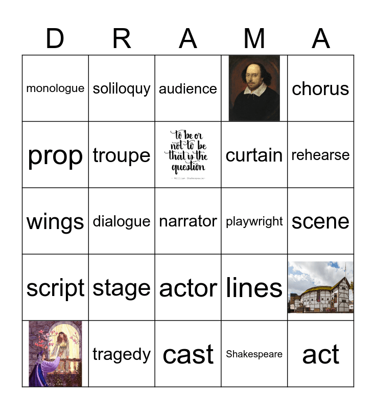 This bingo card has 5 images and 25 words: tragedy, comedy, dialogue, prologue, monologue, audience, troupe, actor, playwright, cast, scene, narrator, Shakespeare, act, rehearse, scenery, lines, script, stage, chorus, wings, comic relief, soliloquy, curtain and prop.