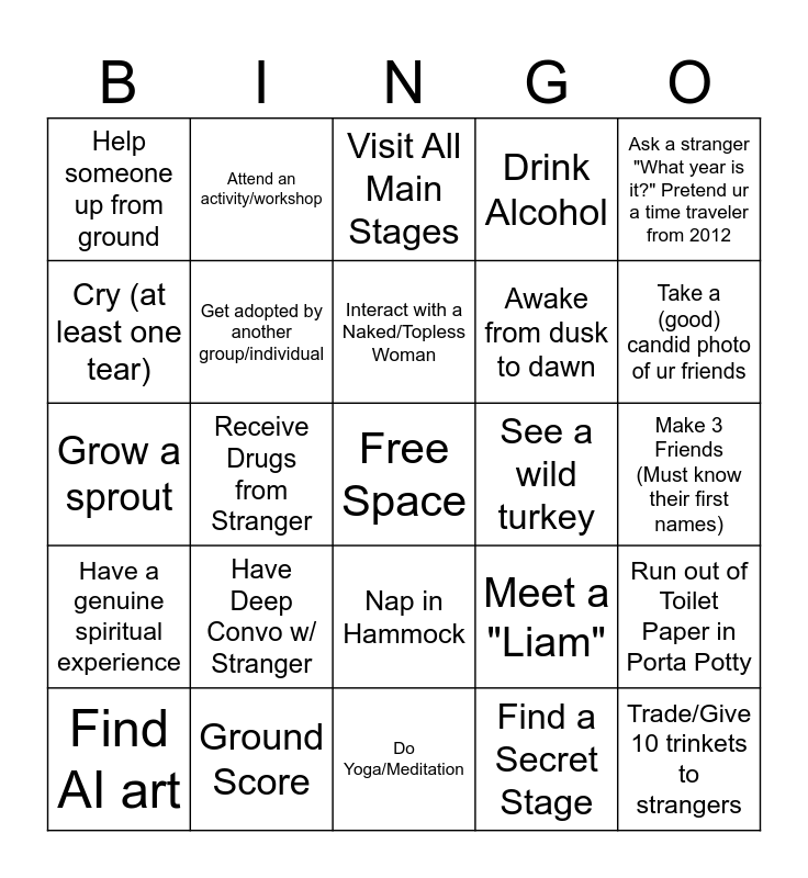 This bingo card has a free space and 24 words: Have Deep Convo w/ Stranger, Ground Score, Interact with a Naked/Topless Woman, Find AI art, Ask a stranger "What year is it?" Pretend ur a time traveler from 2012, Help someone up from ground, Cry (at least one tear), Attend an activity/workshop, See a wild turkey, Nap in Hammock, Awake from dusk to dawn, Grow a sprout, Meet a "Liam", Run out of Toilet Paper in Porta Potty, Get adopted by another group/individual, Find a Secret Stage, Make 3 Friends (Must know their first names), Visit All Main Stages, Take a (good) candid photo of ur friends, Receive Drugs from Stranger, Trade/Give 10 trinkets to strangers, Have a genuine spiritual experience, Drink Alcohol and Do Yoga/Meditation.