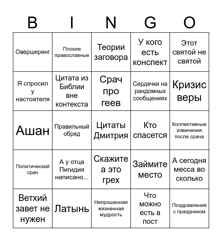 This bingo card has a free space and 24 words: А у отца Пигидия написано..., Латынь, Срач про геев, Ветхий завет не нужен, Этот святой не святой, Овершеринг, Я спросил у настоятеля, Плохие православные, Кто спасется, Скажите а это грех, Сердечки на рандомных сообщениях, Ашан, Займите место, А сегодня месса во сколько, Цитата из Библии вне контекста, Что можно есть в пост, Коллективные извинения после срача, Теории заговора, Кризис веры, Правильный обряд, Поздравления с праздником, Политический срач, У кого есть конспект and Непрошенная жизненная мудрость.