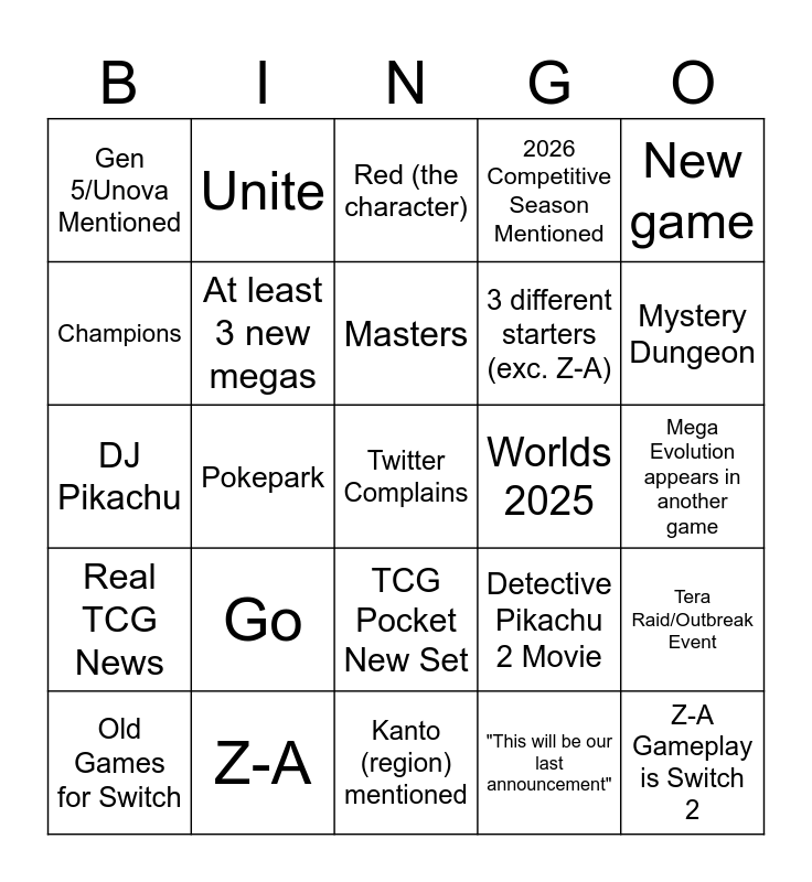 This bingo card has a free space and 24 words: Go, Z-A, Masters, Old Games for Switch, New game, Gen 5/Unova Mentioned, Champions, Unite, Worlds 2025, TCG Pocket New Set, 3 different starters (exc. Z-A), DJ Pikachu, Detective Pikachu 2 Movie, Tera Raid/Outbreak Event, At least 3 new megas, "This will be our last announcement", Mega Evolution appears in another game, Red (the character), Mystery Dungeon, Pokepark, Z-A Gameplay is Switch 2, Real TCG News, 2026 Competitive Season Mentioned and Kanto (region) mentioned.