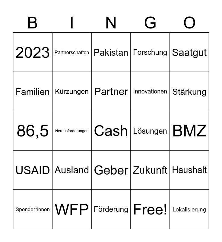 This bingo card has 32 words: Free!, 2024, Herausforderungen, EZ, USAID, Kürzungen, Saatgut, Haushalt, Partnerschaften, Lokalisierung, Partner, Pakistan, 37, 18,7, Lösungen, Erfolge, Spender*innen, 86,5, Geber, Ausland, Zukunft, HuHi, BMZ, WFP, Cash, Forschung, Innovationen, Familien, 2023, Förderung, Mut and Stärkung.
