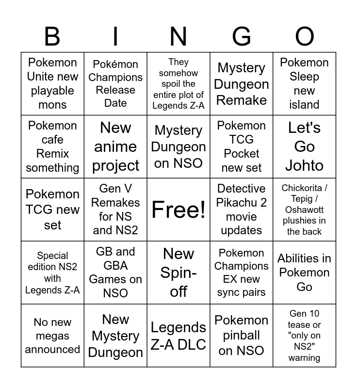 This bingo card has a free space and 24 words: GB and GBA Games on NSO, New Mystery Dungeon, Mystery Dungeon on NSO, No new megas announced, Pokemon Sleep new island, Pokemon Unite new playable mons, Pokemon cafe Remix something, Pokémon Champions Release Date, Detective Pikachu 2 movie updates, New Spin-off, Pokemon TCG Pocket new set, Pokemon TCG new set, Pokemon Champions EX new sync pairs, Abilities in Pokemon Go, New anime project, Pokemon pinball on NSO, Chickorita / Tepig / Oshawott plushies in the back, They somehow spoil the entire plot of Legends Z-A, Let's Go Johto, Gen V Remakes for NS and NS2, Gen 10 tease or "only on NS2" warning, Special edition NS2 with Legends Z-A, Mystery Dungeon Remake and Legends Z-A DLC.
