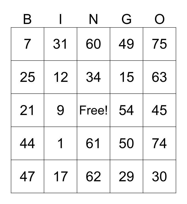 This bingo card has a free space and 24 words: 1, 17, 34, 47, 75, 7, 25, 31, 54, 61, 15, 21, 50, 74, 12, 29, 45, 60, 63, 9, 30, 44, 49 and 62.
