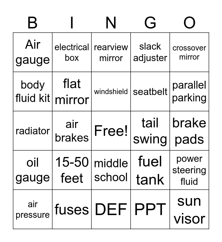 This bingo card has a free space and 153 words: school bus, driver, fuel tank, DVIR, shackle, tires, rear emergency exit, washer fluid, 4-way flashers, first aid kit, steering wheel, head lights, seatbelt, pitman arm, brake pads, crossover mirror, steps, lug nuts, wig wag, LLLC, monitor, Elementary School, manager, radio, roof hatch, spring seat, PPT, oil gauge, air filter, compressor, destination sign, battery box, brake line, seats, charters, learning center, stop signs, children, backing, RR crossing, intersections, following distance, tail swing, defensive driving, pre trip, post trip, student loading, student unloading, WC securement, diesel fuel, BTW, parallel parking, clean bus, mechanics, bumper, crossing arm, hoses, water pump, alternator, reflective tape, electrical box, Lug locks, step light, 120 PSI, cross fans, differential, 15-50 feet, turnaround, U-bolt, child check alarm, inspection, registration, fuses, bus circle, blue bird, international, WC lift, double child check, pink tag, check engine light, steering column, sun visor, taxi, air brakes, flat mirror, convex mirror, service brake, parking brake, air pressure, Air gauge, RPM, DEF, Engine, gas pedal, governor, Air tank, master switch, dome lights, heaters, speedometer, defroster, body fluid kit, fire extinguisher, reflective triangles, red lights, amber lights, horn, wipers, high beams, turn signal, blinker, brake test, rearview mirror, dispatch, discipline referral, CDL, seatbelt cutter, high school, middle school, side emergency door, service door, handrail, clearance lights, windshield, license plate, serpentine belt, coolant, radiator, axle, leaf springs, slack adjuster, push rod, brake drum, rim, tread, valve stem, mud flap, transmission, power steering fluid, dipstick, gear box, drag link, shock absorber, drive shaft, hood, windows, reflectors, muffler, exhaust, frame, cross member, noise suppressor and sidewall.