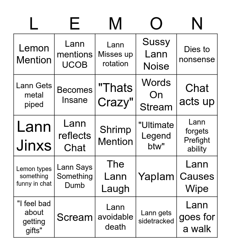 This bingo card has a free space and 24 words: Lann Says Something Dumb, Scream, "Thats Crazy", "I feel bad about getting gifts", Dies to nonsense, Lemon Mention, Lann Gets metal piped, Lann mentions UCOB, "Ultimate Legend btw", The Lann Laugh, Words On Stream, Lann Jinxs, YapIam, Lann Causes Wipe, Becomes Insane, Lann gets sidetracked, Lann forgets Prefight ability, Lann Misses up rotation, Chat acts up, Lann reflects Chat, Lann goes for a walk, Lemon types something funny in chat, Sussy Lann Noise and Lann avoidable death.