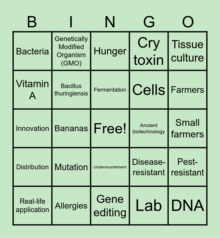 This bingo card has a free space and 50 words: Biotechnology, DNA, Genes, Gene editing, Mutation, Genetic modification, Genetically Modified Organism (GMO), Golden Rice, Vitamin A, Bt crops, Bacillus thuringiensis, Cry toxin, Pest-resistant, Disease-resistant, Crop yield, Selective breeding, Fermentation, Ancient biotechnology, Modern biotechnology, Tissue culture, Bananas, Lab, Bacteria, Cells, Agriculture, Farming, Farmers, Food security, Hunger, Undernourishment, Productivity, Harvest, Monoculture, Biodiversity, Allergies, Labeling, Ethics, Seeds, Big companies, Small farmers, Health risks, Ecosystem, Resistance, Scientific tools, Real-life application, Innovation, Food safety, Sustainability, Distribution and Modification.