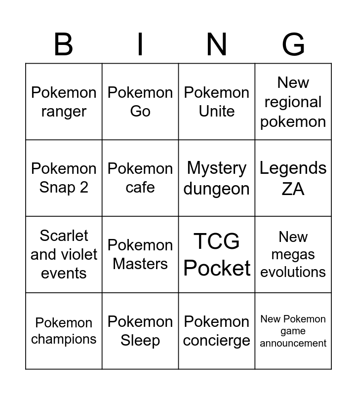This bingo card has 16 words: Pokemon Sleep, New megas evolutions, Pokemon Unite, Pokemon ranger, Scarlet and violet events, Pokemon Go, TCG Pocket, Pokemon concierge, Pokemon Snap 2, Pokemon cafe, Pokemon champions, New regional pokemon, Pokemon Masters, Legends ZA, Mystery dungeon and New Pokemon game announcement.