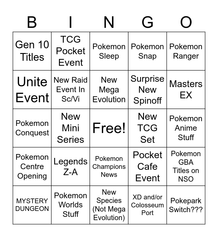 This bingo card has a free space and 25 words: Legends Z-A, New Species (Not Mega Evolution), New Mega Evolution, MYSTERY DUNGEON, Pokemon Ranger, Gen 10 Titles, Unite Event, TCG Pocket Event, New TCG Set, Pokemon Champions News, Surprise New Spinoff, Pokemon Conquest, Pocket Cafe Event, Pokemon GBA Titles on NSO, New Raid Event In Sc/Vi, Pokemon Go News/Event, Pokemon Anime Stuff, Pokemon Sleep, Masters EX, New Mini Series, Pokepark Switch???, Pokemon Worlds Stuff, Pokemon Centre Opening, Pokemon Snap and XD and/or Colosseum Port.