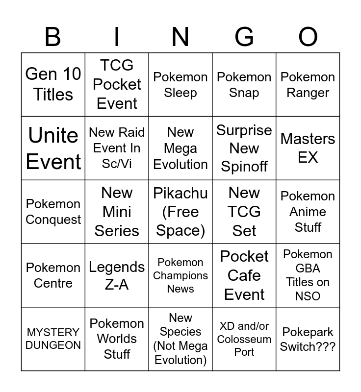 This bingo card has a free space and 25 words: Legends Z-A, New Species (Not Mega Evolution), New Mega Evolution, MYSTERY DUNGEON, Pokemon Ranger, Gen 10 Titles, Unite Event, TCG Pocket Event, New TCG Set, Pokemon Champions News, Surprise New Spinoff, Pokemon Conquest, Pocket Cafe Event, Pokemon GBA Titles on NSO, New Raid Event In Sc/Vi, Pokemon Go News/Event, Pokemon Anime Stuff, Pokemon Sleep, Masters EX, New Mini Series, Pokepark Switch???, Pokemon Worlds Stuff, Pokemon Centre, Pokemon Snap and XD and/or Colosseum Port.