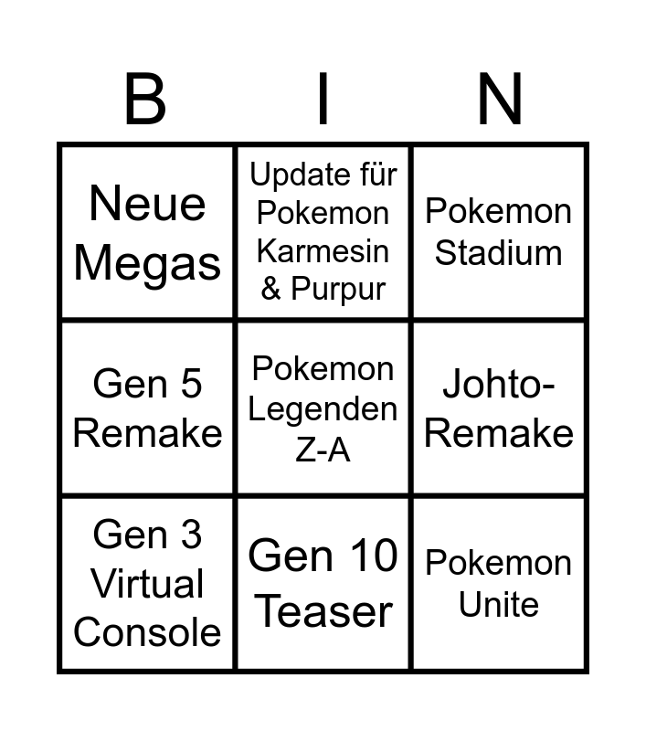 This bingo card has a free space and 8 words: Johto-Remake, Pokemon Stadium, Update für Pokemon Karmesin & Purpur, Gen 3 Virtual Console, Neue Megas, Pokemon Unite, Gen 5 Remake and Gen 10 Teaser.