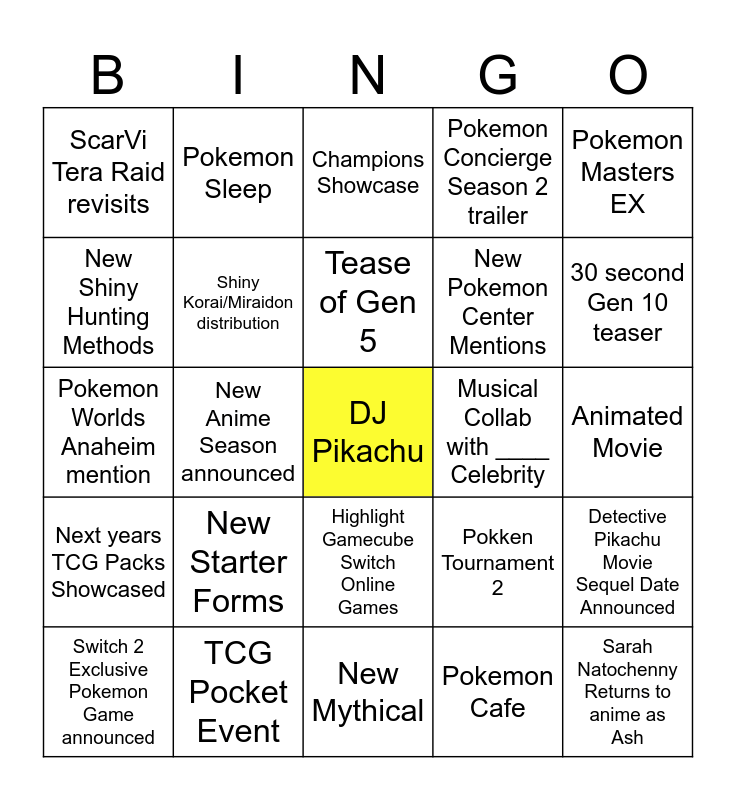 This bingo card has a free space and 24 words: New Starter Forms, TCG Pocket Event, Tease of Gen 5, Switch 2 Exclusive Pokemon Game announced, Pokemon Masters EX, ScarVi Tera Raid revisits, New Shiny Hunting Methods, Pokemon Sleep, Musical Collab with ____ Celebrity, Highlight Gamecube Switch Online Games, New Pokemon Center Mentions, Pokemon Worlds Anaheim mention, Pokken Tournament 2, Detective Pikachu Movie Sequel Date Announced, Shiny Korai/Miraidon distribution, Pokemon Cafe, Animated Movie, Champions Showcase, 30 second Gen 10 teaser, New Anime Season announced, Sarah Natochenny Returns to anime as Ash, Next years TCG Packs Showcased, Pokemon Concierge Season 2 trailer and New Mythical.