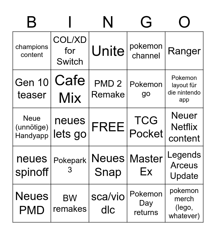 This bingo card has a free space and 24 words: Pokepark 3, BW remakes, PMD 2 Remake, Neues PMD, Ranger, champions content, Gen 10 teaser, COL/XD for Switch, TCG Pocket, Neues Snap, Pokemon go, Neue (unnötige) Handyapp, Master Ex, Legends Arceus Update, Cafe Mix, Pokemon Day returns, Neuer Netflix content, Unite, Pokemon layout für die nintendo app, neues lets go, pokemon merch (lego, whatever), neues spinoff, pokemon channel and sca/vio dlc.