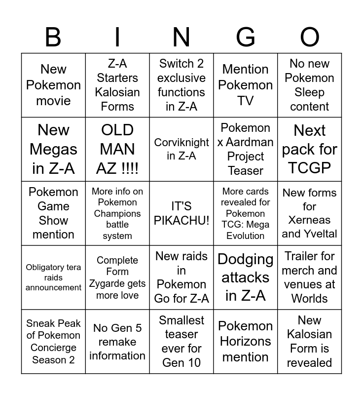 This bingo card has a free space and 24 words: Complete Form Zygarde gets more love, No Gen 5 remake information, Corviknight in Z-A, Sneak Peak of Pokemon Concierge Season 2, No new Pokemon Sleep content, New Pokemon movie, New Megas in Z-A, Z-A Starters Kalosian Forms, More cards revealed for Pokemon TCG: Mega Evolution, New raids in Pokemon Go for Z-A, Pokemon x Aardman Project Teaser, Pokemon Game Show mention, Dodging attacks in Z-A, Trailer for merch and venues at Worlds, OLD MAN AZ !!!!, Pokemon Horizons mention, New forms for Xerneas and Yveltal, Switch 2 exclusive functions in Z-A, Next pack for TCGP, More info on Pokemon Champions battle system, New Kalosian Form is revealed, Obligatory tera raids announcement, Mention Pokemon TV and Smallest teaser ever for Gen 10.