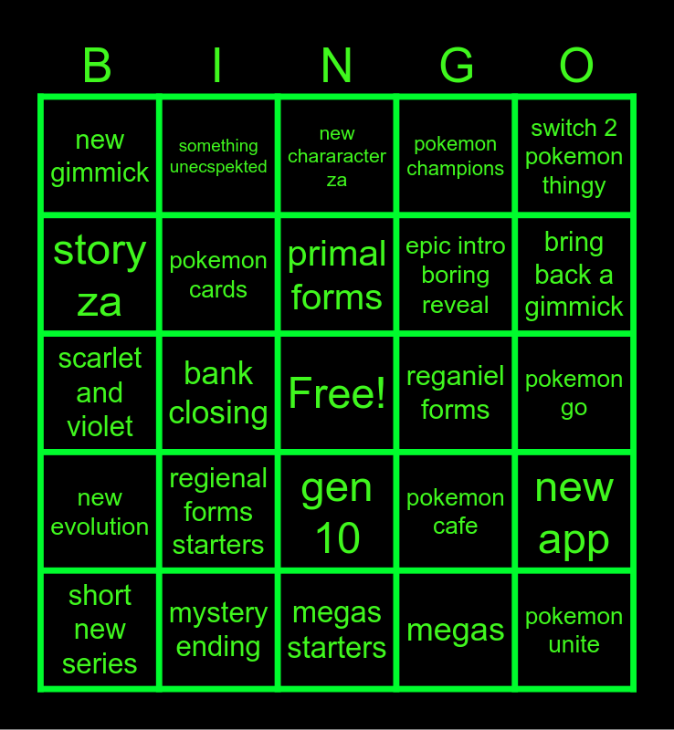 This bingo card has a free space and 24 words: regienal forms starters, mystery ending, primal forms, short new series, switch 2 pokemon thingy, new gimmick, story za, something unecspekted, reganiel forms, gen 10, epic intro boring reveal, scarlet and violet, pokemon cafe, new app, pokemon cards, megas, pokemon go, new chararacter za, bring back a gimmick, bank closing, pokemon unite, new evolution, pokemon champions and megas starters.
