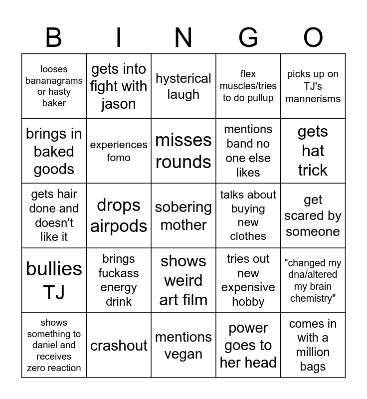 This bingo card has a free space and 24 words: brings fuckass energy drink, crashout, misses rounds, shows something to daniel and receives zero reaction, picks up on TJ's mannerisms, looses bananagrams or hasty baker, brings in baked goods, gets into fight with jason, talks about buying new clothes, shows weird art film, mentions band no one else likes, gets hair done and doesn't like it, tries out new expensive hobby, "changed my dna/altered my brain chemistry", experiences fomo, power goes to her head, get scared by someone, hysterical laugh, gets hat trick, drops airpods, comes in with a million bags, bullies TJ, flex muscles/tries to do pullup and mentions vegan.