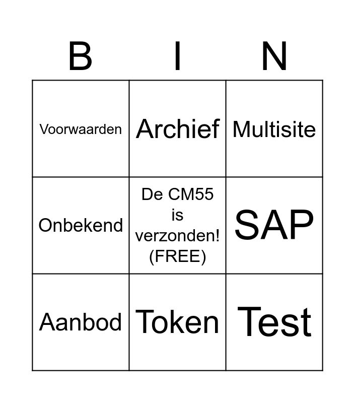 This bingo card has a free space and 19 words: TLK, Wetgeving, Multisite, Content, CM55 uitgesteld, Test, Tarieven, Voorwaarden, Archief, Verlicht, POP, SAP, Aanbod, JZ, KWO, Blijven Loont, Onbekend, Token and Onverwachts.