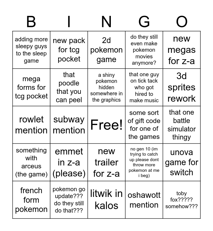 This bingo card has a free space and 24 words: emmet in z-a (please), pokemon go update??? do they still do that???, a shiny pokemon hidden somewhere in the graphics, french form pokemon, new megas for z-a, adding more sleepy guys to the sleep game, mega forms for tcg pocket, new pack for tcg pocket, some sort of gift code for one of the games, new trailer for z-a, that one guy on tick tack who got hired to make music, rowlet mention, no gen 10 (im trying to catch up please dont throw more pokemon at me i beg), unova game for switch, that poodle that you can peel, oshawott mention, that one battle simulator thingy, 2d pokemon game, 3d sprites rework, subway mention, toby fox????? somehow???, something with arceus (the game), do they still even make pokemon movies anymore? and litwik in kalos.