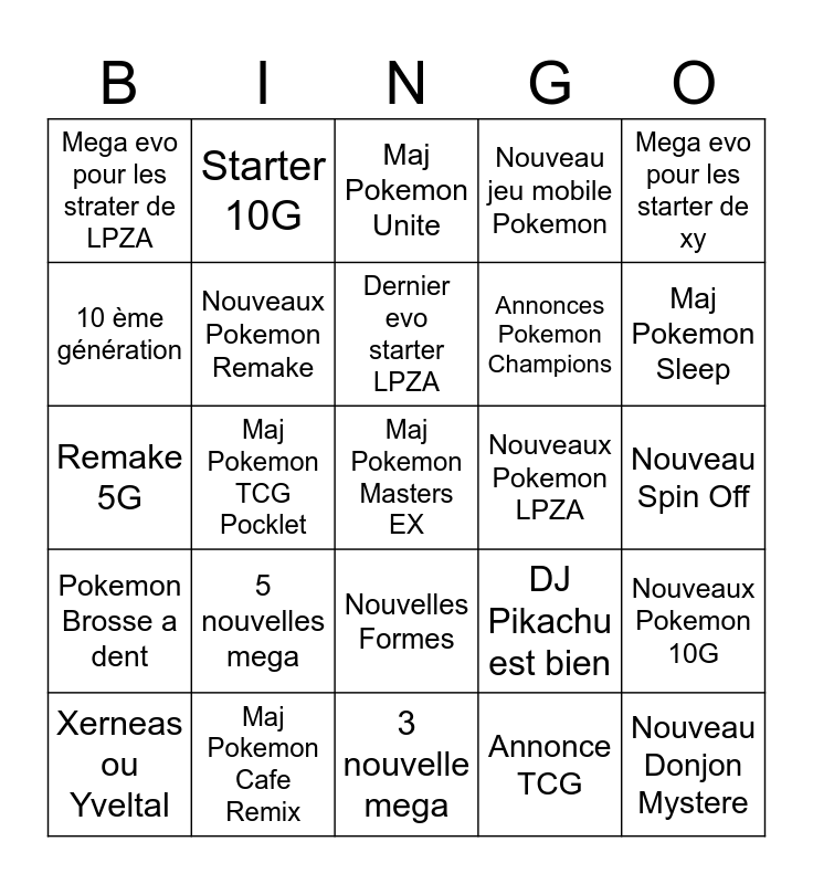 This bingo card has 25 words: 5 nouvelles mega, 3 nouvelle mega, Dernier evo starter LPZA, Xerneas ou Yveltal, Mega evo pour les starter de xy, Mega evo pour les strater de LPZA, 10 ème génération, Starter 10G, Nouveaux Pokemon LPZA, Nouvelles Formes, Annonces Pokemon Champions, Remake 5G, DJ Pikachu est bien, Nouveaux Pokemon 10G, Nouveaux Pokemon Remake, Nouveau Donjon Mystere, Nouveau Spin Off, Maj Pokemon Unite, Maj Pokemon Sleep, Maj Pokemon TCG Pocklet, Maj Pokemon Masters EX, Maj Pokemon Cafe Remix, Pokemon Brosse a dent, Nouveau jeu mobile Pokemon and Annonce TCG.