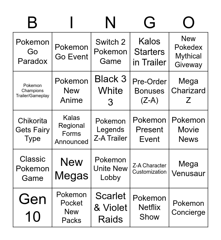 This bingo card has a free space and 24 words: New Megas, Pokemon Pocket New Packs, Black 3 White 3, Gen 10, New Pokedex Mythical Giveway, Pokemon Go Paradox, Pokemon Champions Trailer/Gameplay, Pokemon Go Event, Pokemon Present Event, Pokemon Unite New Lobby, Pre-Order Bonuses (Z-A), Chikorita Gets Fairy Type, Z-A Character Customization, Mega Venusaur, Pokemon New Anime, Pokemon Netflix Show, Pokemon Movie News, Switch 2 Pokemon Game, Mega Charizard Z, Kalas Regional Forms Announced, Pokemon Concierge, Classic Pokemon Game, Kalos Starters in Trailer and Scarlet & Violet Raids.