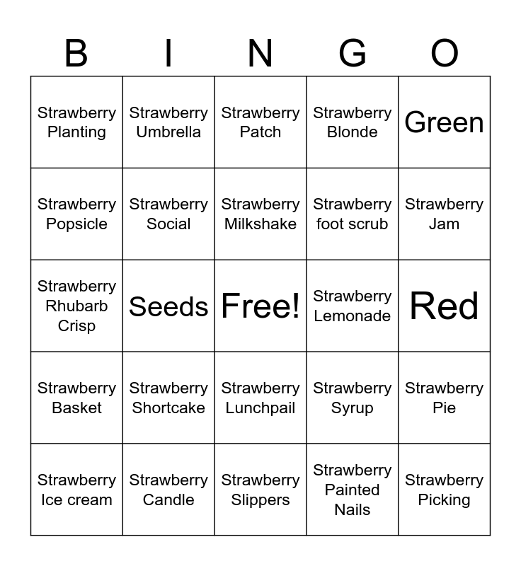 This bingo card has a free space and 24 words: Strawberry Shortcake, Strawberry Candle, Strawberry Milkshake, Strawberry Ice cream, Green, Strawberry Planting, Strawberry Popsicle, Strawberry Umbrella, Strawberry Lemonade, Strawberry Lunchpail, Strawberry foot scrub, Strawberry Rhubarb Crisp, Strawberry Syrup, Strawberry Pie, Strawberry Social, Strawberry Painted Nails, Red, Strawberry Patch, Strawberry Jam, Seeds, Strawberry Picking, Strawberry Basket, Strawberry Blonde and Strawberry Slippers.