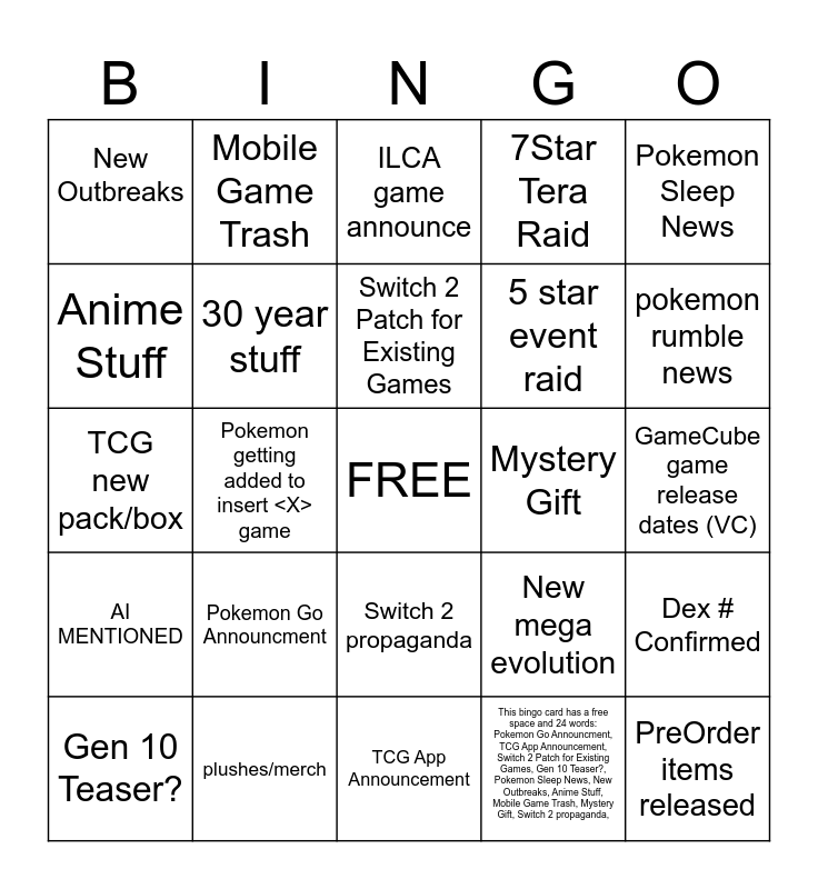 This bingo card has a free space and 25 words: Pokemon Go Announcment, TCG App Announcement, Switch 2 Patch for Existing Games, Gen 10 Teaser?, Pokemon Sleep News, New Outbreaks, Anime Stuff, Mobile Game Trash, Mystery Gift, Switch 2 propaganda, 5 star event raid, TCG new pack/box, New mega evolution, Dex # Confirmed, 30 year stuff, New Pokemon, GameCube game release dates (VC), ILCA game announce, pokemon rumble news, Pokemon getting added to insert <X> game, PreOrder items released, plushes/merch, AI MENTIONED, 7Star Tera Raid and This bingo card has a free space and 24 words: Pokemon Go Announcment, TCG App Announcement, Switch 2 Patch for Existing Games, Gen 10 Teaser?, Pokemon Sleep News, New Outbreaks, Anime Stuff, Mobile Game Trash, Mystery Gift, Switch 2 propaganda,.
