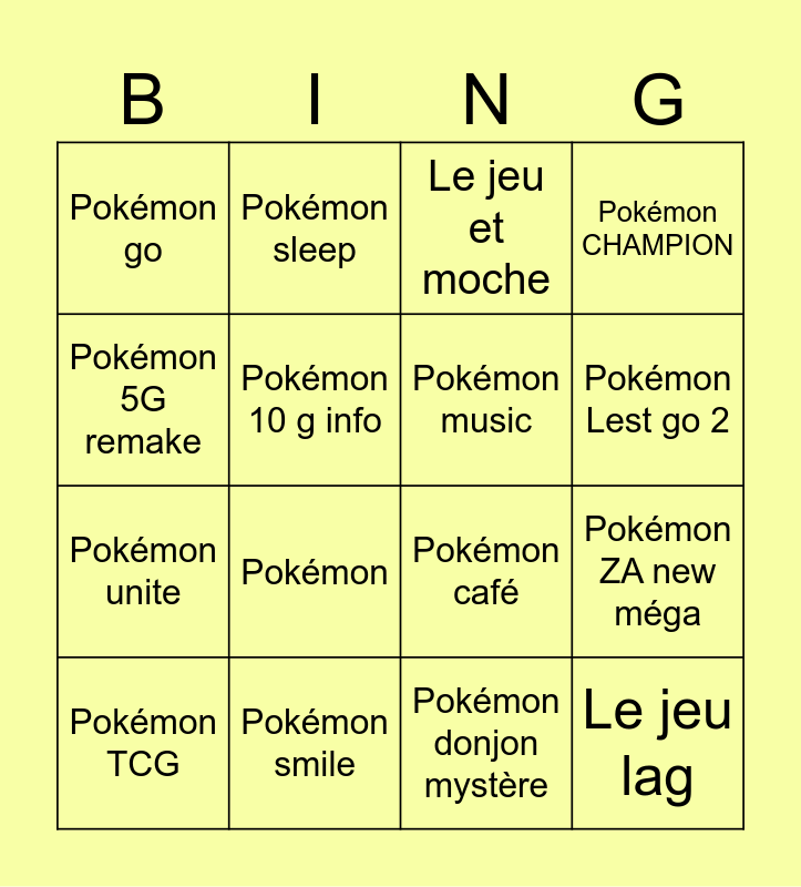 This bingo card has 16 words: Pokémon smile, Pokémon ZA new méga, Le jeu et moche, Pokémon go, Pokémon unite, Pokémon sleep, Pokémon café, Pokémon donjon mystère, Pokémon 5G remake, Pokémon 10 g info, Pokémon TCG, Pokémon CHAMPION, Pokémon, Pokémon Lest go 2, Pokémon music and Le jeu lag.
