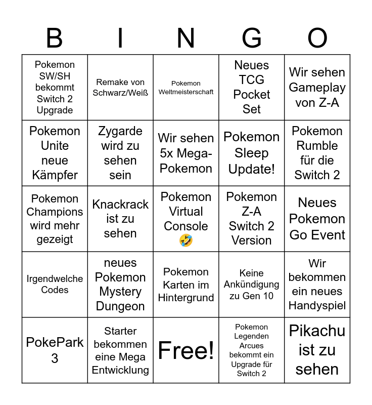This bingo card has 25 words: Irgendwelche Codes, Starter bekommen eine Mega Entwicklung, Pokemon Virtual Console 🤣, Pokemon Legenden Arcues bekommt ein Upgrade für Switch 2, Wir sehen Gameplay von Z-A, Pokemon SW/SH bekommt Switch 2 Upgrade, Remake von Schwarz/Weiß, Pokemon Weltmeisterschaft, Pokemon Z-A Switch 2 Version, Wir bekommen ein neues Handyspiel, Pokemon Unite neue Kämpfer, Zygarde wird zu sehen sein, Free!, Keine Ankündigung zu Gen 10, Pokemon Rumble für die Switch 2, PokePark 3, Knackrack ist zu sehen, Wir sehen 5x Mega-Pokemon, Pokemon Sleep Update!, Neues Pokemon Go Event, Pokemon Champions wird mehr gezeigt, neues Pokemon Mystery Dungeon, Pokemon Karten im Hintergrund, Neues TCG Pocket Set and Pikachu ist zu sehen.